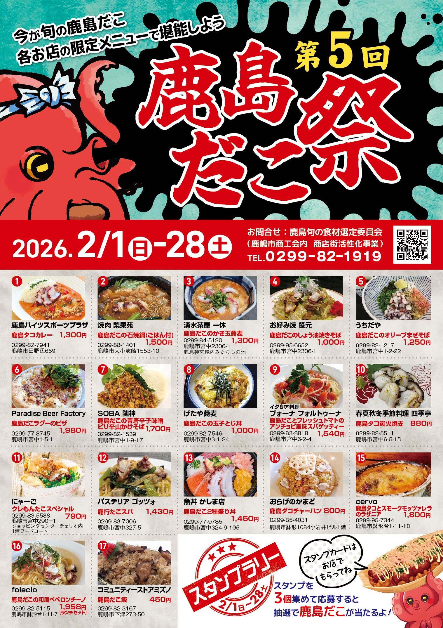 「食のフェア かしま食べ物語」は、「鹿嶋市の食材を使い鹿嶋市を盛り上げて行きたい!」、「鹿嶋市のおいしい食材をおいしく食べていただきたい!」そんな気持ちから始まりました。鹿嶋食材の生産者&鹿嶋食材を料理する店舗を両方楽しめるイベントです! 鹿嶋市の食材を使って『ここだけ、これだけ、今だけ』の3条件を整えた鹿嶋限定のメニューを参加店でお楽しみください。 新着情報 投稿は見つかりませんでした イベント情報 第五回 鹿島だこ祭り 第四回 鹿島だこ祭り 第三回 鹿島だこ祭り 第二回 鹿島だこ祭り 第一回 鹿島だこ祭り 過去の食べ物語 第八章 かしまし豚食のフェア 鹿島食べ物語 第七章 鹿嶋産レンコン食のフェア 鹿島食べ物語 第六章 鹿島灘しらす食のフェア しらす 第五章 かしまし豚食のフェア 鹿島食べ物語 第四章 鹿島だこ食のフェア 鹿島食べ物語 第三章 鹿島だこ食のフェア 鹿島食べ物語 第二章 かしまし豚食のフェア 鹿島食べ物語 第一章 生きくらげ食のフェア 鹿島食べ物語 Youtubeチャンネル